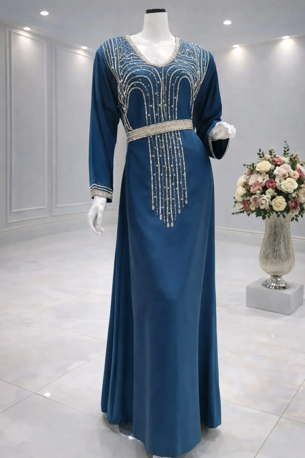 قفطان مغربي قطعتين كم فرنسي شغال يدوي غرز فضي