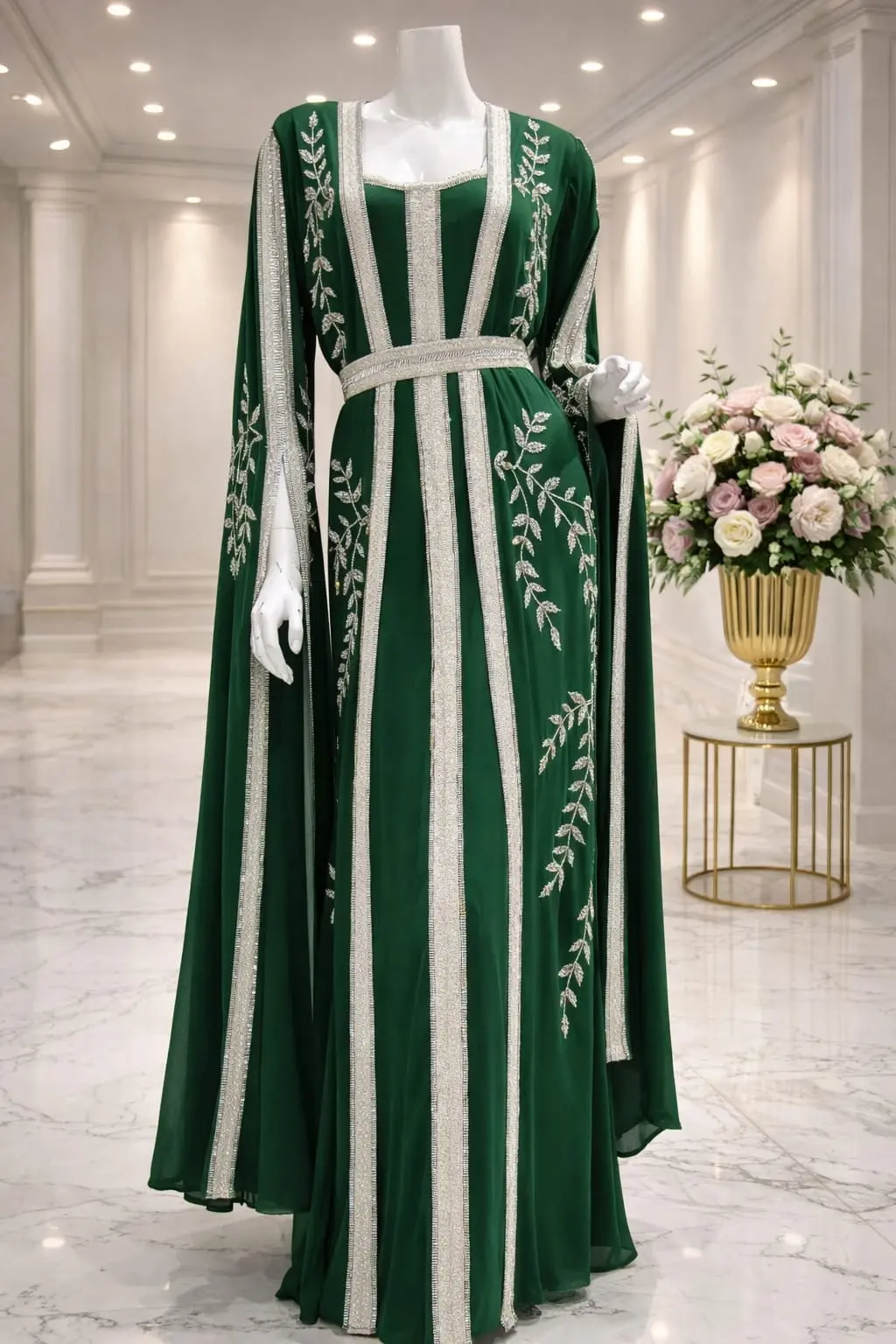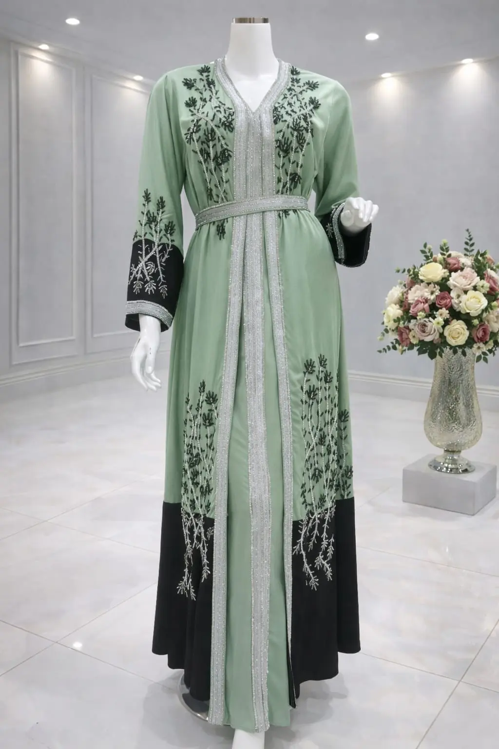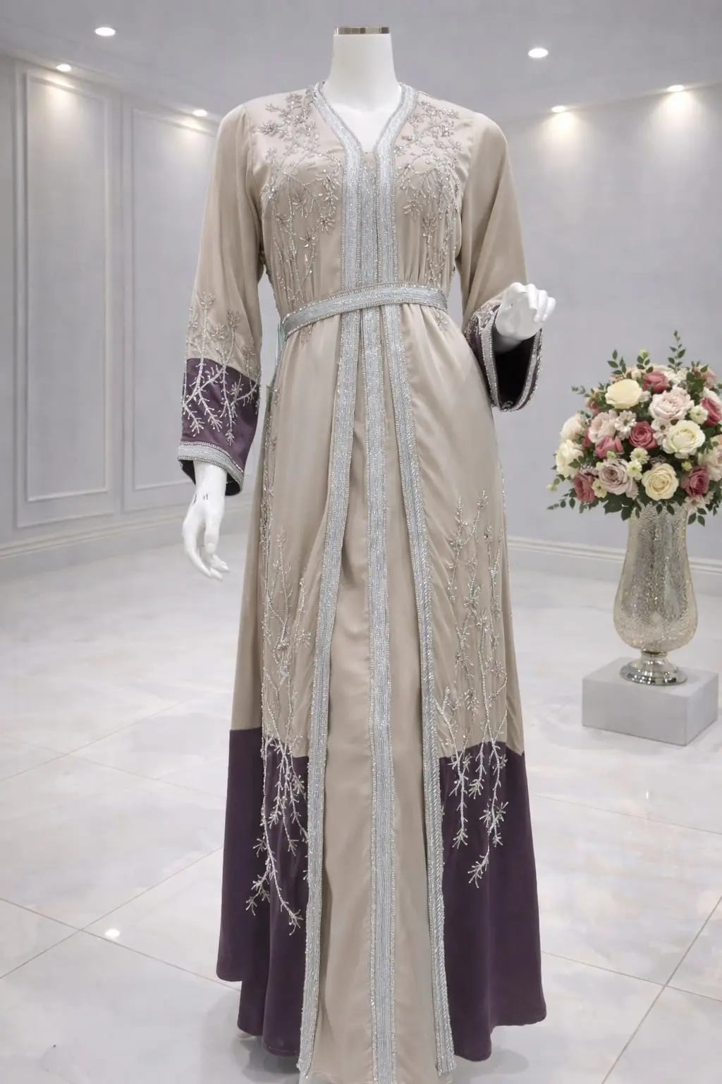 قفطان مغربي قطعتين كم فرنسي شغال يدوي غرز فضي