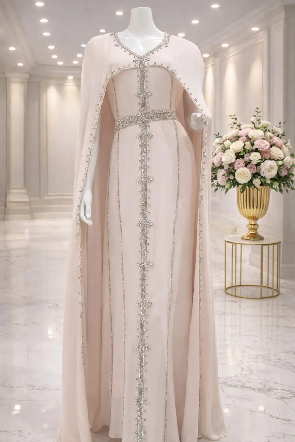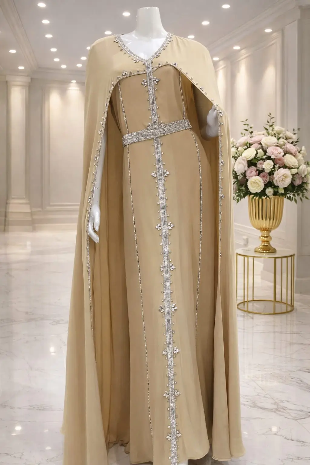 قفطان مغربي اكمام فرنسي شغل يدوي غرز فضي